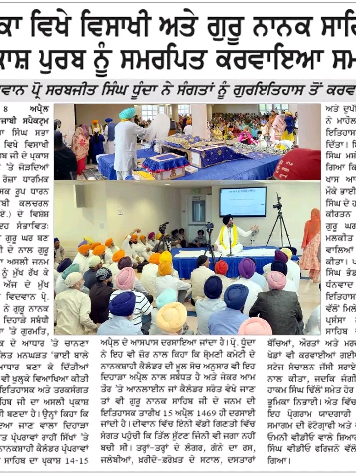 ਗੁਰਦੁਆਰਾ ਸਿੰਘ ਸਭਾ ਫਰਿਜਨੋ ਵਿਖੇ ਵਿਸਾਖੀ ਅਤੇ ਗੁਰੂ ਨਾਨਕ ਸਾਹਿਬ ਜੀ ਦੇ ਪ੍ਰਕਾਸ਼ ਦਿਹਾੜੇ ਨੂੰ ਇੱਕੋ ਮੰਚ ‘ਤੇ ਜੋੜਦਿਆਂ ਕਰਵਾਏ ਗਏ ਤਿੰਨ ਰੋਜ਼ਾ ਧਾਰਮਿਕ ਸਮਾਗਮ ਨੇ ਇਤਿਹਾਸਕ ਰੂਪ ਧਾਰਨ ਕਰ ਲਿਆ। ਪੰਜਾਬੀ ਕਲਚਰਲ ਐਸੋਸੀਏਸ਼ਨ (PCA) ਦੇ ਵਿਸ਼ੇਸ਼ ਉਪਰਾਲੇ ਸਦਕਾ ਇਹ ਸੰਭਾਵਿਤ: ਅਮਰੀਕਾ ਦਾ ਪਹਿਲਾ ਗੁਰੂ ਘਰ ਬਣ ਗਿਆ, ਜਿੱਥੇ ਵਿਸਾਖੀ ਦੇ ਨਾਲ ਗੁਰੂ ਨਾਨਕ ਸਾਹਿਬ ਜੀ ਦਾ ਅਸਲੀ ਜਨਮ ਦਿਹਾੜਾ 15 ਅਪ੍ਰੈਲ ਨੂੰ ਮੁੱਖ ਰੱਖ ਕੇ ਮਨਾਇਆ ਗਿਆ।ਅੱਜ ਦੇ ਮੁੱਖ ਦੀਵਾਨ ਵਿੱਚ ਪ੍ਰਸਿੱਧ ਵਿਦਵਾਨ ਪ੍ਰੋ. ਸਰਬਜੀਤ ਸਿੰਘ ਧੂੰਦਾ ਨੇ ਗੁਰੂ ਨਾਨਕ ਸਾਹਿਬ ਜੀ ਦੇ ਜਨਮ ਦਿਹਾੜੇ ਸਬੰਧੀ ਚੱਲ ਰਹੀ ਲੰਬੀ ਚਰਚਾ ‘ਤੇ ਗੁਰਮਤਿ, ਇਤਿਹਾਸ ਅਤੇ ਤਰਕ ਦੇ ਆਧਾਰ ‘ਤੇ ਚਾਨਣਾ ਪਾਇਆ। ਉਨ੍ਹਾਂ ਨੇ ਪ੍ਰਚੱਲਿਤ ਮਨਘੜਤ “ਭਾਈ ਬਾਲੇ ਵਾਲੀ ਸਾਖੀ” ਨੂੰ ਅਧਾਰ ਬਣਾ ਕੇ ਦਿੱਤੀਆਂ ਜਾਂਦੀਆਂ ਦਲੀਲਾਂ ਦੀ ਵੀ ਖੁਲ੍ਹਕੇ ਵਿਆਖਿਆ ਕੀਤੀ ਅਤੇ ਸਮਝਾਇਆ ਕਿ ਇਤਿਹਾਸਕ ਅਤੇ ਤਰਕਸੰਗਤ ਪੱਖੋਂ ਗੁਰੂ ਨਾਨਕ ਸਾਹਿਬ ਜੀ ਦਾ ਅਸਲੀ ਪ੍ਰਕਾਸ਼ ਦਿਹਾੜਾ 15 ਅਪ੍ਰੈਲ ਹੀ ਬਣਦਾ ਹੈ। ਉਨ੍ਹਾਂ ਕਿਹਾ ਕਿ ਨਵੰਬਰ ਵਿੱਚ ਮਨਾਇਆ ਜਾਣ ਵਾਲਾ ਦਿਹਾੜਾ ਬਾਅਦ ਦੀਆਂ ਵਿਪਰੀਤ ਪਰੰਪਰਾਵਾਂ ਰਾਹੀਂ ਸਿੱਖਾਂ ‘ਤੇ ਥੋਪਿਆ ਗਿਆ। ਕੁਝ ਨਾਨਕਸ਼ਾਹੀ ਕੈਲੰਡਰ ਪਰੰਪਰਾਵਾਂ ਵਿੱਚ ਵੀ ਗੁਰੂ ਨਾਨਕ ਸਾਹਿਬ ਦਾ ਪ੍ਰਕਾਸ਼ 14–15 ਅਪ੍ਰੈਲ ਦੇ ਆਸਪਾਸ ਦਰਸਾਇਆ ਜਾਂਦਾ ਹੈ।ਪ੍ਰੋ. ਧੂੰਦਾ ਨੇ ਇਹ ਵੀ ਜ਼ੋਰ ਨਾਲ ਕਿਹਾ ਕਿ ਸ਼੍ਰੋਮਣੀ ਕਮੇਟੀ ਦੇ ਨਾਨਕਸ਼ਾਹੀ ਕੈਲੰਡਰ ਦੀ ਮੂਲ ਸੋਚ ਅਨੁਸਾਰ ਵੀ ਇਹ ਦਿਹਾੜਾ ਅਪ੍ਰੈਲ ਨਾਲ ਸੰਬੰਧਿਤ ਹੈ, ਅਤੇ ਜੇਕਰ ਆਮ ਤੌਰ ‘ਤੇ ਆਨਲਾਈਨ ਜਾਂ ਕੈਲੰਡਰ ਸਰੋਤ ਵੇਖੇ ਜਾਣ ਤਾਂ ਵੀ ਗੁਰੂ ਨਾਨਕ ਸਾਹਿਬ ਜੀ ਦੇ ਜਨਮ ਦੀ ਇਤਿਹਾਸਕ ਤਾਰੀਖ 15 ਅਪ੍ਰੈਲ 1469 ਹੀ ਦਰਸਾਈ ਜਾਂਦੀ ਹੈ।ਦੀਵਾਨ ਵਿੱਚ ਇੰਨੀ ਵੱਡੀ ਗਿਣਤੀ ਵਿੱਚ ਸੰਗਤ ਪਹੁੰਚੀ ਕਿ ਤਿੱਲ ਸੁੱਟਣ ਜਿੰਨੀ ਵੀ ਜਗ੍ਹਾ ਨਹੀਂ ਬਚੀ ਸੀ। ਤਰ੍ਹਾਂ-ਤਰ੍ਹਾਂ ਦੇ ਲੰਗਰ, ਗੰਨੇ ਦਾ ਰਸ, ਜਲੇਬੀਆਂ, ਖ਼ਰੀਦੋ-ਫ਼ਰੋਖ਼ਤ ਦੇ ਸਟਾਲ, ਦਸਤਾਰਾਂ ਅਤੇ ਦੁਪੱਟਿਆਂ ਦੀਆਂ ਦੁਕਾਨਾਂ ਨੇ ਮਾਹੌਲ ਨੂੰ ਪੰਜਾਬ ਦੇ ਕਿਸੇ ਇਤਿਹਾਸਕ ਮੇਲੇ ਦਾ ਰੂਪ ਦੇ ਦਿੱਤਾ। ਇਸਦੇ ਨਾਲ ਅਵਤਾਰ ਸਿੰਘ ਮਸ਼ੀਨਰੀ ਵੱਲੋਂ ਲਾਇਆ ਗਿਆ ਕਿਤਾਬਾਂ ਦਾ ਸਟਾਲ ਵੀ ਖਾਸ ਆਕਰਸ਼ਣ ਰਿਹਾ।ਇਸ ਮੌਕੇ ਭਾਈ ਸਾਹਿਬ ਡਾ. ਮਲਕੀਤ ਸਿੰਘ ਦੇ ਹਜ਼ੂਰੀ ਜਥੇ ਨੇ ਰਸਭਿੰਨਾ ਕੀਰਤਨ ਕਰਕੇ ਹਾਜ਼ਰੀ ਭਰੀ। ਗੁਰੂ ਘਰ ਦੇ ਮੁੱਖ ਸੇਵਾਦਾਰ ਮਲਕੀਤ ਸਿੰਘ ਕਰਨਾਲ ਵਾਲਿਆਂ ਨੇ ਸੰਗਤ ਨੂੰ ਸੰਬੋਧਨ ਕੀਤਾ। ਪੀਸੀਏ ਮੈਂਬਰ ਸੁਖਬੀਰ ਸਿੰਘ ਭੰਡਾਲ ਨੇ ਸਾਰਿਆਂ ਦਾ ਧੰਨਵਾਦ ਕਰਦਿਆਂ ਇਸ ਇਤਿਹਾਸਕ ਉਪਰਾਲੇ ਨੂੰ ਸੰਗਤ ਵੱਲੋਂ ਮਿਲੇ ਭਰਪੂਰ ਸਹਿਯੋਗ ਦੀ ਪ੍ਰਸ਼ੰਸਾ ਕੀਤੀ।