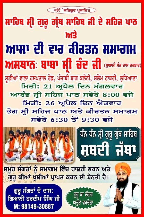 ਗੁਰ ਸੰਗਤ ਜੀ ਅਸਥਾਨ ਤੇ ਮਿਤੀ 21 ਤਰੀਕ ਸ਼੍ਰੀ ਗੁਰੂ ਗ੍ਰੰਥ ਸਾਹਿਬ ਜੀ ਸ਼ਬਦੀ ਜੱਥੇ ਵਲੋਂ ਸ਼੍ਰੀ ਸਹਿਜ ਪਾਠਸਵੇਰੇ 8 ਵਜੇ ਸ਼੍ਰੀ ਸਹਿਜ ਪਾਠ ਆਰੰਭ ਹੋਣਗੇ ਮਿਤੀ 26 ਤਰੀਕ ਐਤਵਾਰ ਸਮਾਪਤੀ ਜੀ ਦਰਸ਼ਨ ਬਖਸ਼ੋ ਜੀ - Gurduwara News Channel