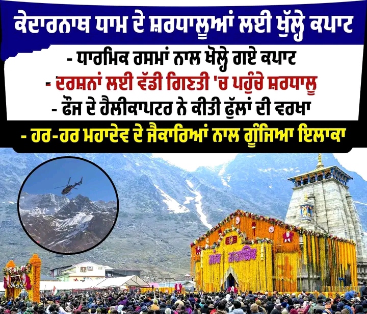 ਕੇਦਾਰਨਾਥ ਧਾਮ ਦੇ ਸ਼ਰਧਾਲੂਆਂ ਲਈ ਖੁੱਲ੍ਹੇ ਕਪਾਟ